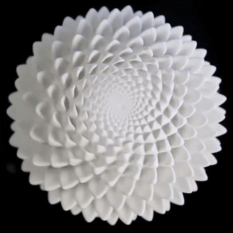 Golden Mean Polymer Art-Design: Golden mean designed polymer structure on a spinning table. Golden angle strobe lighting (every 137.5°). The sculpture seems to come alive, slowed down from its base spin, even moving against base spin, behaving as if its a completely independent entity, as alive.